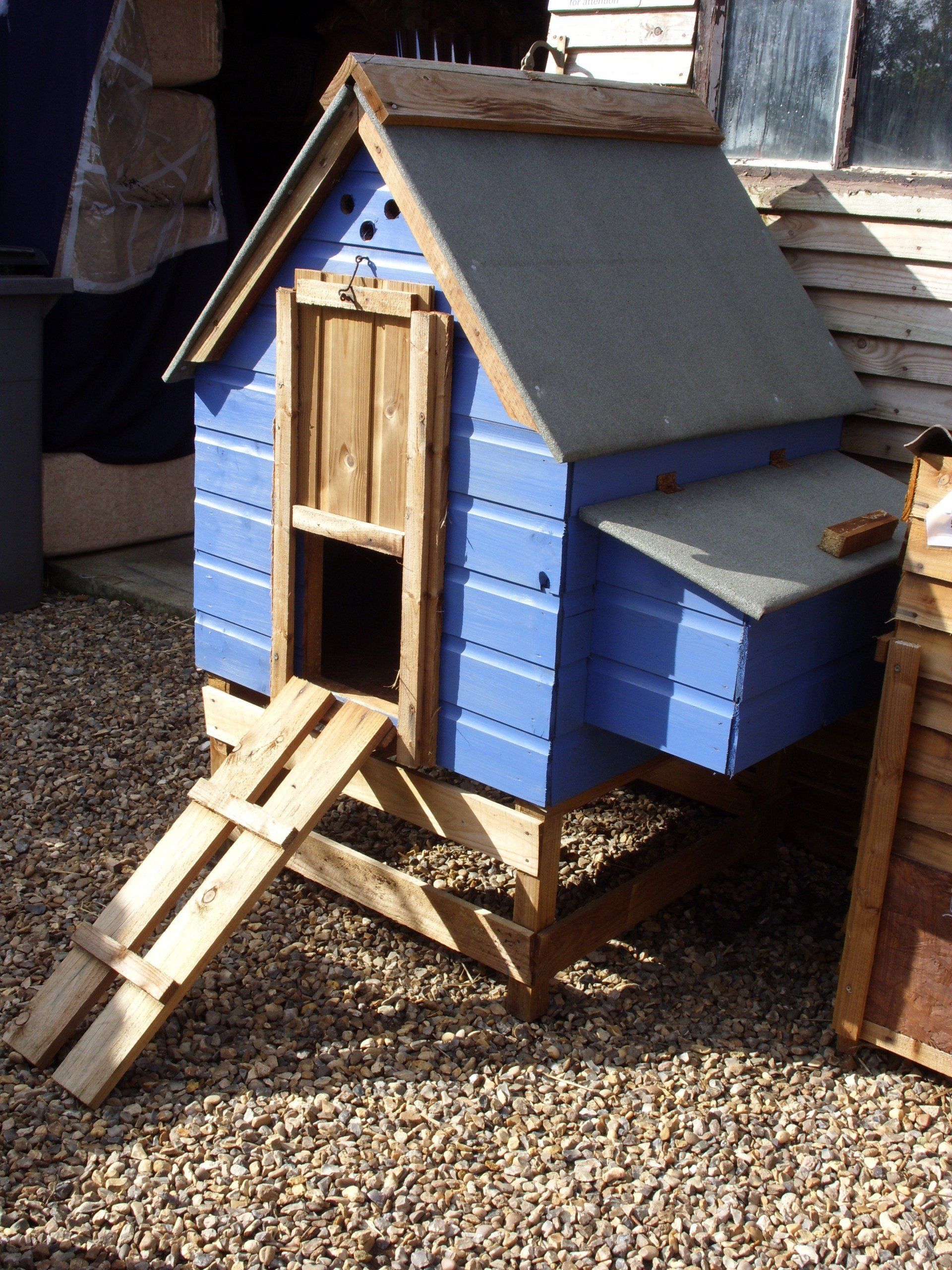 with 1' hinged nesting box on side (felt lid - not shown on photo), sliding floor for easy cleaning (with wooden handles), hinged rear door with bolt, sliding front door, access ramp and corrugated bitumen roof.